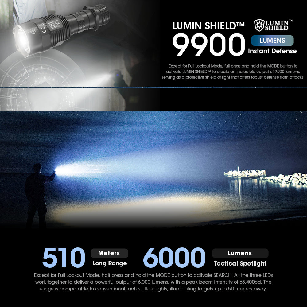 Expect for Full lockout mode, full press and hold the Mode button to activate LUMIN SHIELDTM to create an incredible out of 9,900 lumens, serving as a protective shield of light that offers robust defence from attacks.