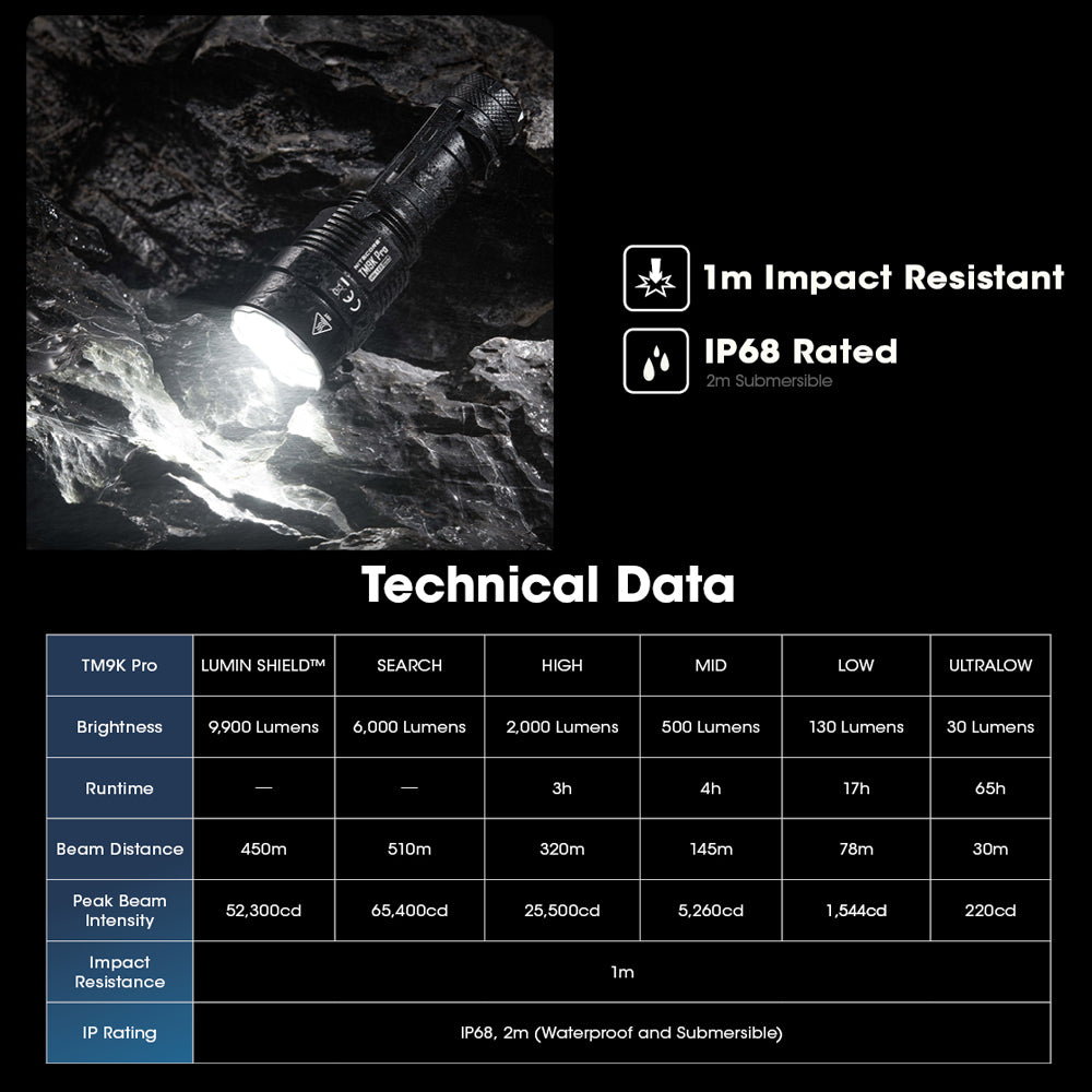The TM (Tiny Monster) Series leads in the way in exploring the ultimate performance of NITECORE’s flashlights. The TM9K Pro introduces a new LED layout with three innovative UHi 40 MAX LEDs that deliver both ultra-high brightness and tactical long-range capabilities, ideal for everyday use, outdoor adventures or tactical situations.