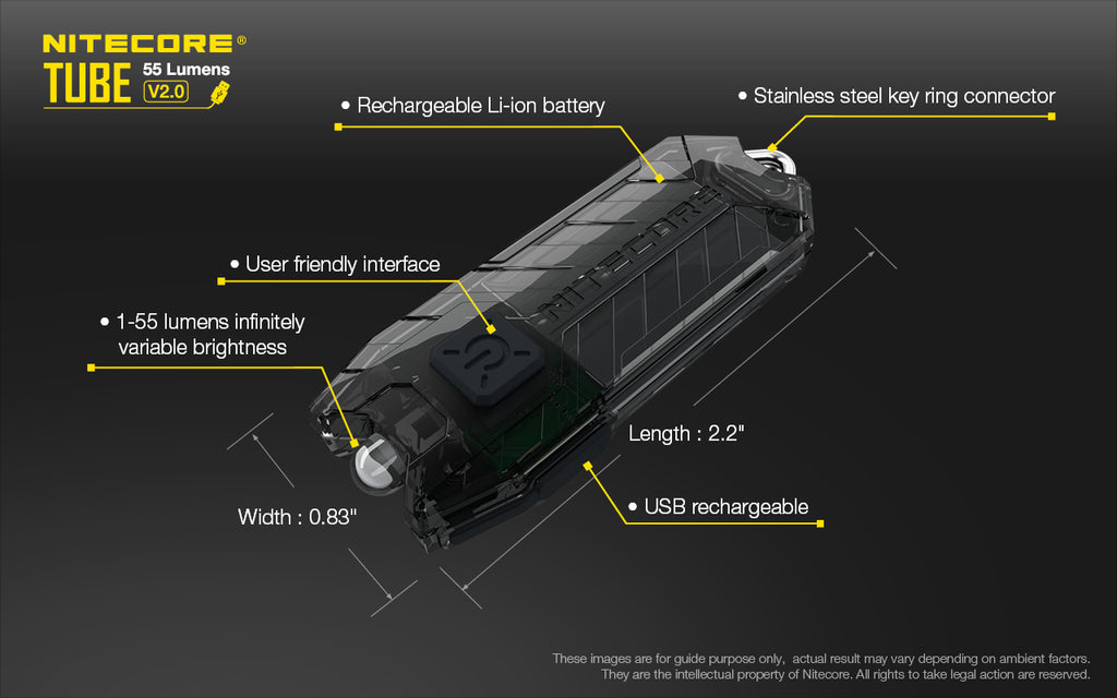 The Nitecore TUBE v2 LED Key Chain Flashlight (Black) is dust- and water-resistant, 1-55-lumen key chain LED flashlight. It has a single multi-stage switch that allows you to choose either a low or high output, as well as an infinitely variable output in-between when using the brightness feature. A built-in Li-ion battery charges via a micro-USB port and can provide up to 58 hours of runtime on low output or 1.3 hours on high. The light is impact resistant up to 3.3' and IP65 water-resistant. At 2.2 x 0.8 x 0.3" and just 0.3 ounces, it's about the size of a car key fob except much lighter—you'll never want to be without it on your key ring.